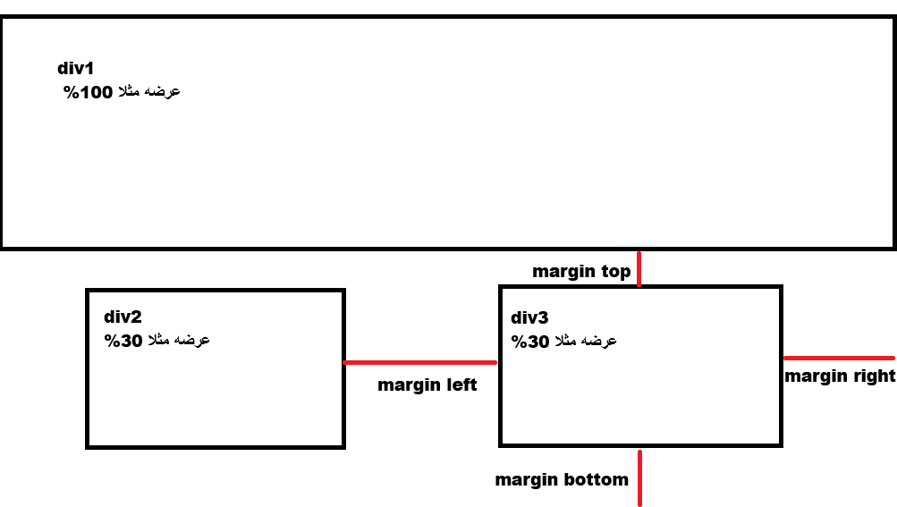 بالصورة اعلاه اذا كتبنا للـ div الثالث margin-top فان هذه المسافة هي المسافة بين حد ال div الثالث وبين حد ال div الاول لان الـ div الاول فوق ال div الثالث.... أما اذا كتبنا margin-right فان هذه المسافة هي المسافة بين حد ال div الثالث وبين حد الصفحة من جهة اليمين لان ليس هناك عنصر على يمينه .. واذا كتبنا margin-bottom فان هذه المسافة هي المسافة بين حد ال div الثالث وبين حد الصفحة من الاسفل ايضا لان ليس هناك عنصر اسفل منه.. واذا كتبنا margin-left فان هذه المسافة هي المسافة بين حد ال div الثالث وبين حد ال div الثاني لان ال div الثاني على يسار ال div الثالث..